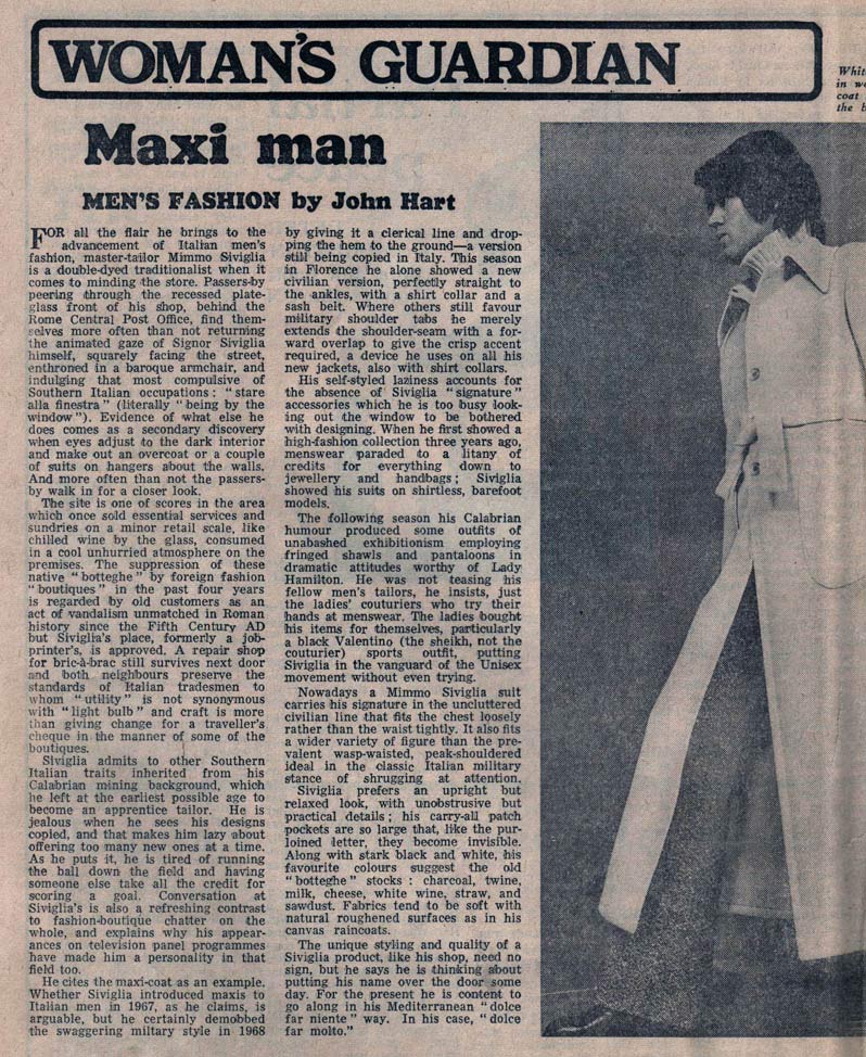 As calças cobrem os sapatos e os casacos têm ombros quadrados e bandas largas, mas as gravatas não aparecem na moda proposta por Siviglia, que utiliza as camisolas de gola alta e as camisas de colarinho desapertado.