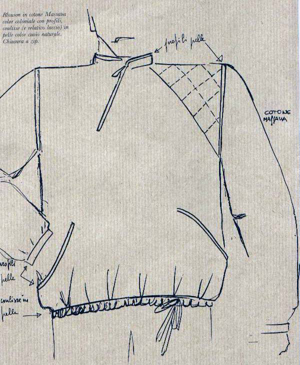 Temi dell’attuale sfilata: completi per pioggia, con sahariana, in neplax nero; maxi impermeabili di tela di vela e vinile; scialli con frange, tuniche accappatoi per il mare; tuniche ancora per la sera; casacche, bluse con maniche a sbuffo ecc.